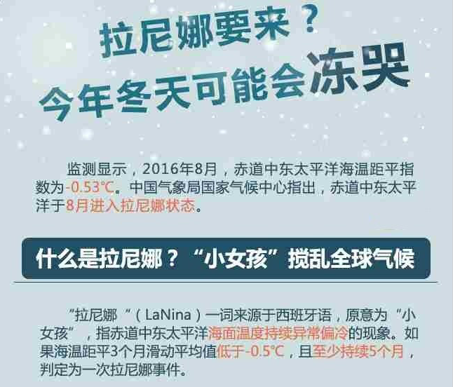 原來,目前赤道中東太平洋已進入拉尼娜狀態,并可能發展成一次拉尼娜事件,和厄爾尼諾一樣,這個小女孩會攪亂全球氣候,但影響卻與厄爾尼諾相反,容易造成我國冬季氣候偏冷,容易出現冷冬。